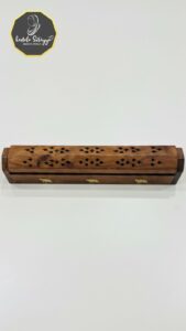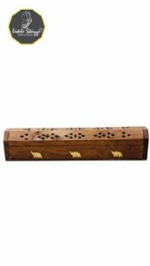 A wooden incense stick holder, also known as an agarbatti stand, which is designed to safely hold incense sticks and collect the falling ash